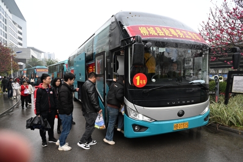 本次返岗采取“大巴接驳+动车直达+专车接送”一站式服务:4辆专车从柳城统一出发送至柳州动车站,动车抵达广州南站后,再由专车分送至广东各地务工地,实现“家门口直达厂门口”,有效解决节后购票难、路途远、中转繁等问题?!耙宦酚腥斯?、全程不操心,太方便了!”务工人员纷纷点赞,感谢政府和工会的贴心服务。