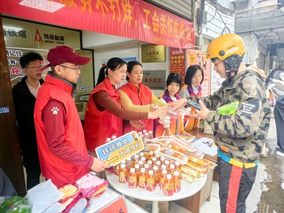 活动聚焦新就业形态劳动者“急难愁盼”问题,量身定制服务清单。工会驿站现场设置互助保障宣传区、免费理发专区,解决户外劳动者“理发难”问题和互助险疑问;开设法律咨询台,由专业律师提供劳动权益、交通安全等实用法律指导;同步发放内含面包、纸巾、袋装螺蛳粉、饮料、矿泉水的“暖心能量包”,满足即时补给需求?;疃奂品裰肮と褐?60余人次,以“看得见、摸得着”的实惠,让劳动者切实感受“娘家人”的坚实依靠。