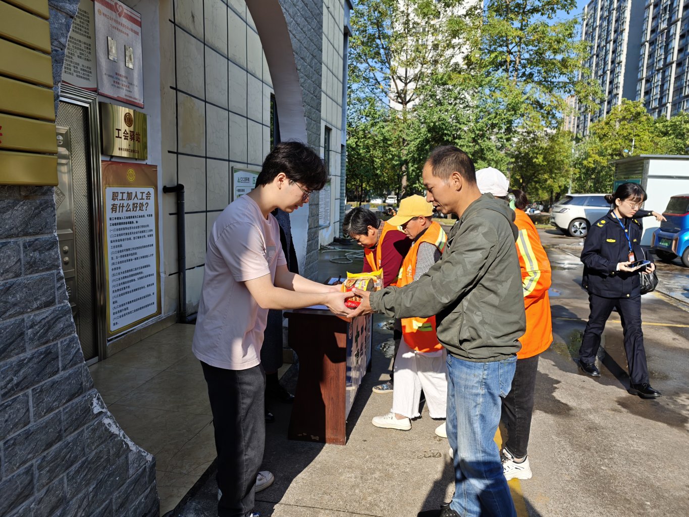 现场,阳和工业新区工会联合辖区工会驿站站点工作人员,向到场的新就业形态劳动者及环卫工人分享了有关劳动者权益保护、社会保险缴纳、劳动安全与健康保护等知识,耐心解答他们在依法维权、困难帮扶、生活救助等方面的疑问,派发了法律服务宣传单张,并免费赠送爱心早餐,让广大新就业形态劳动者在享受“暖心”早餐的同时,共享工会各项普惠服务活动“红利”。活动现场还专门设置了工会服务意见“码上收”,到场领取早餐的新就业形态劳动者只须打开手机,动动手指,扫码关注“工会服务”即可广泛收集劳动者对工会工作的意见建议,为工会工作的优化升级提供参考。