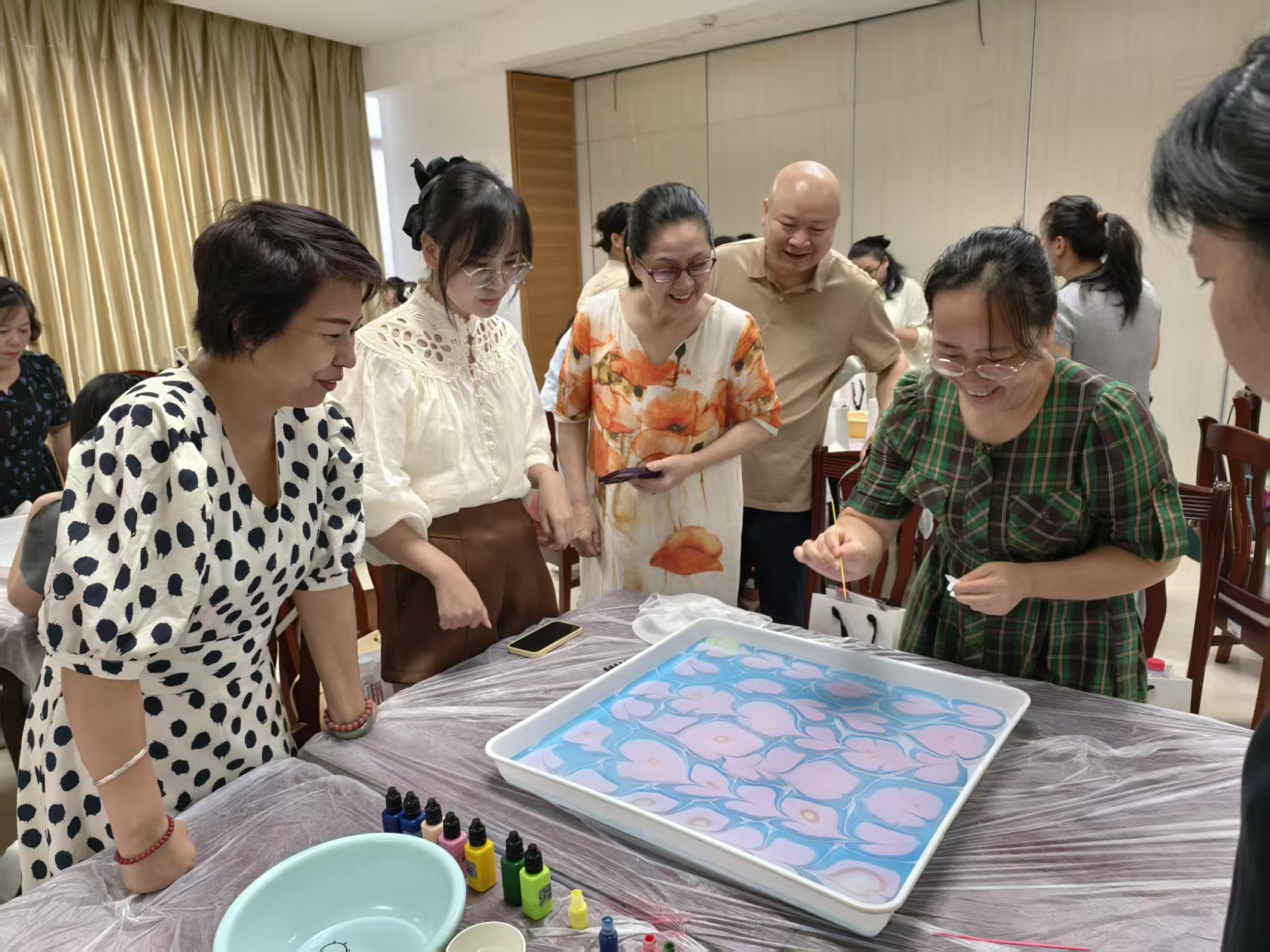 平日里,教职工在忙碌的工作与生活中步履匆匆,在活动中,大家暂时放慢节奏:亲手将珐琅丝弯出喜欢的图案,看着原本平淡的底板逐渐变得色彩斑斓;或是拿起工具轻拨水面,让颜料晕染出独属于自己的画,做成一条条构思独特的丝巾;或是斟起一杯亲手泡开的茶,让茶香从嗅觉慢慢在心里沉淀。