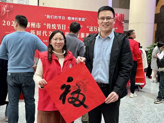 活动现场,来自柳州市书法家协会的30位书法家挽袖执笔,现场墨香阵阵、红幅铺展、笔锋婉转、妙句成双,一句句充满喜气的祝福语跃然纸上,一幅幅龙形字样的“福”字妙趣横生,表达了职工群众对祖国繁荣昌盛的赞美以及对未来美好生活的期许。