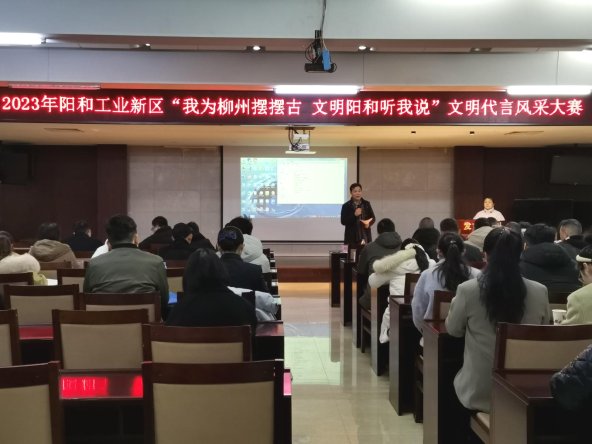 12月22日,阳和工业新区“我为柳州摆摆古 文明阳和听我说”文明代言风采大赛开赛,来自新区各基层单位的15名参赛讲解员,用自己的亲身经历,现场讲述“阳和与创城”“创城与我”的故事。