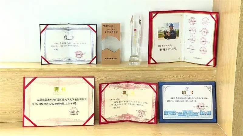 近三年来,黄志欢还带领团队攻坚输电运维智能化数字化转型,近三年开展创新项目21项,成果转化创效260多万元,创新研发动力电池健康检测装置,减少炸机事件90%以上,在柳州城职院开设无人机巡检课程,培养技能人才200多名。因为成绩突出,黄志欢先后获得“第49届国际质量管理ICQCC金奖”、“广西科技进步奖”、“超高压输电公司金牌直线经理”、“广西科技大学创新创业导师”、“柳州工匠”等荣誉。