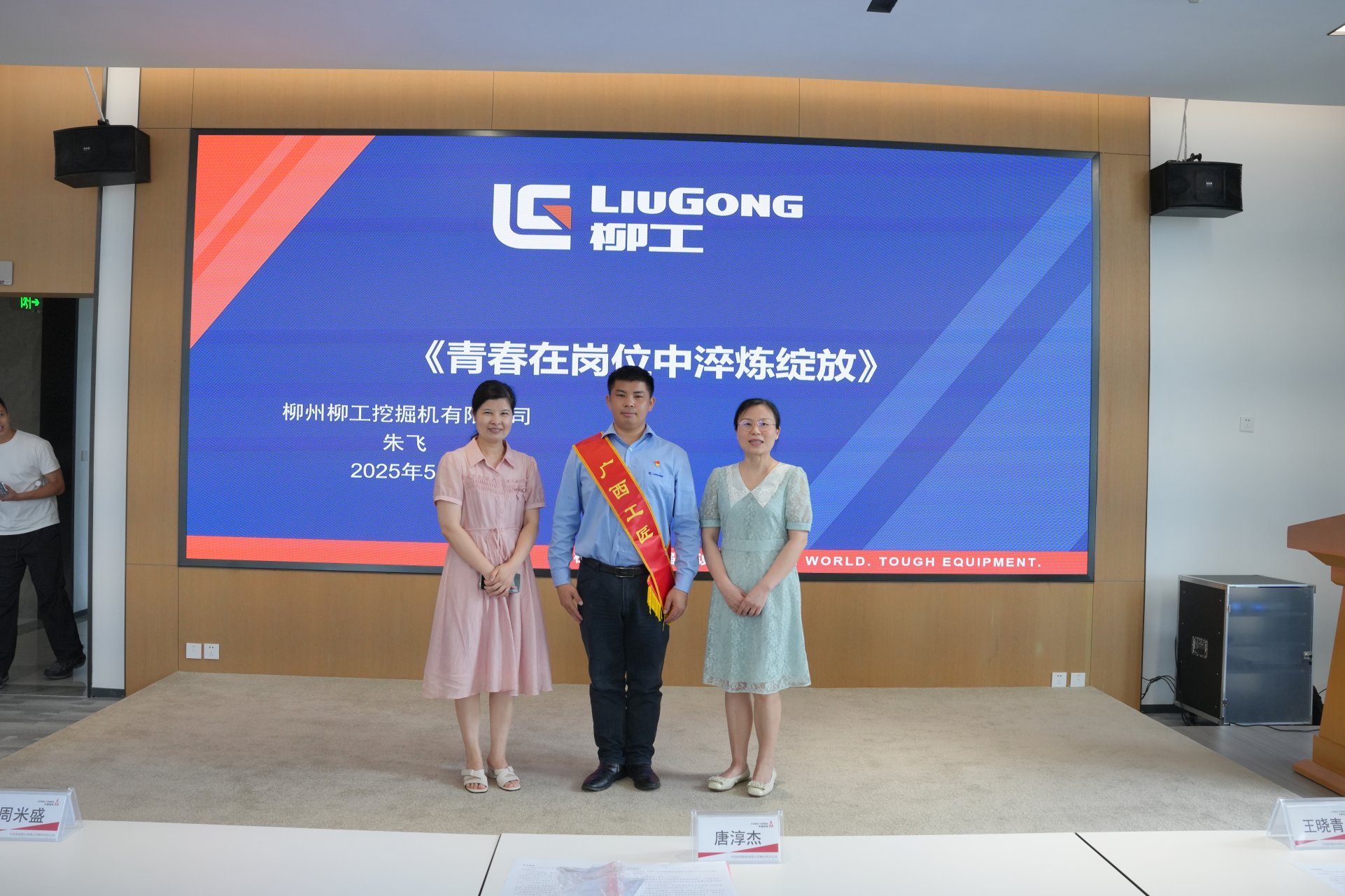主题宣讲环节,来自广西柳工机械股份有限公司的装配钳工朱飞,以《在奋斗奉献中成长》为主题展开分享。作为 “杰出柳州工匠”“挖掘机摘帽”吉尼斯世界纪录保持者,用质朴语言讲述从普通技工到行业标杆的蜕变历程。他回顾 2016 年在央视《吉尼斯中国之夜》用挖掘机 21 秒摘除 6 顶帽子,打破技术垄断;2022年受邀赴意大利米兰挑战 1 分钟摘帽项目,以中国工匠身份站上国际竞技舞台。