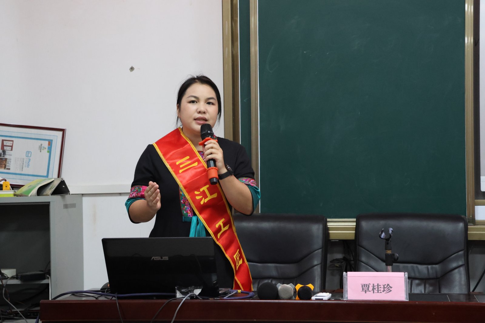 活动中,覃桂珍老师以传承侗族服饰制作技艺为主题,以侗语娓娓道来自己与刺绣的不解之缘。她提到,自幼受母亲熏陶爱上刺绣手艺,大学毕业后毅然接过侗族刺绣家族第5代传承人的接力棒,在县城创办工作室与微车间。为了用新理念突破传统设计瓶颈,她曾为打磨一件精品绣品连续熬夜 40 天;更牵头以“企业+基地+传承人+ 绣娘”模式组建绣坊,带领留守妇女实现家门口就业增收?!鞍衙扛肯叽┖?、每个针脚绣齐,就是工匠精神。”这句质朴的话语,让孩子们在聆听中真切读懂了“匠心”的内涵。