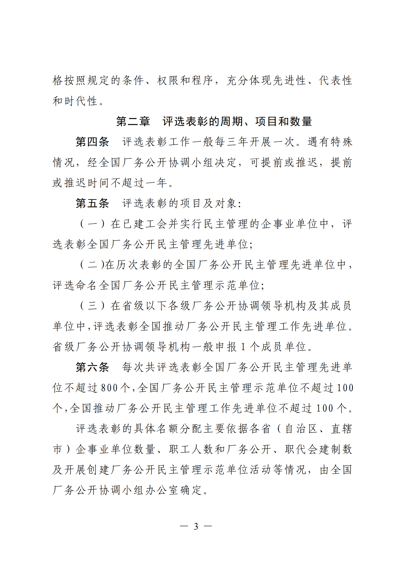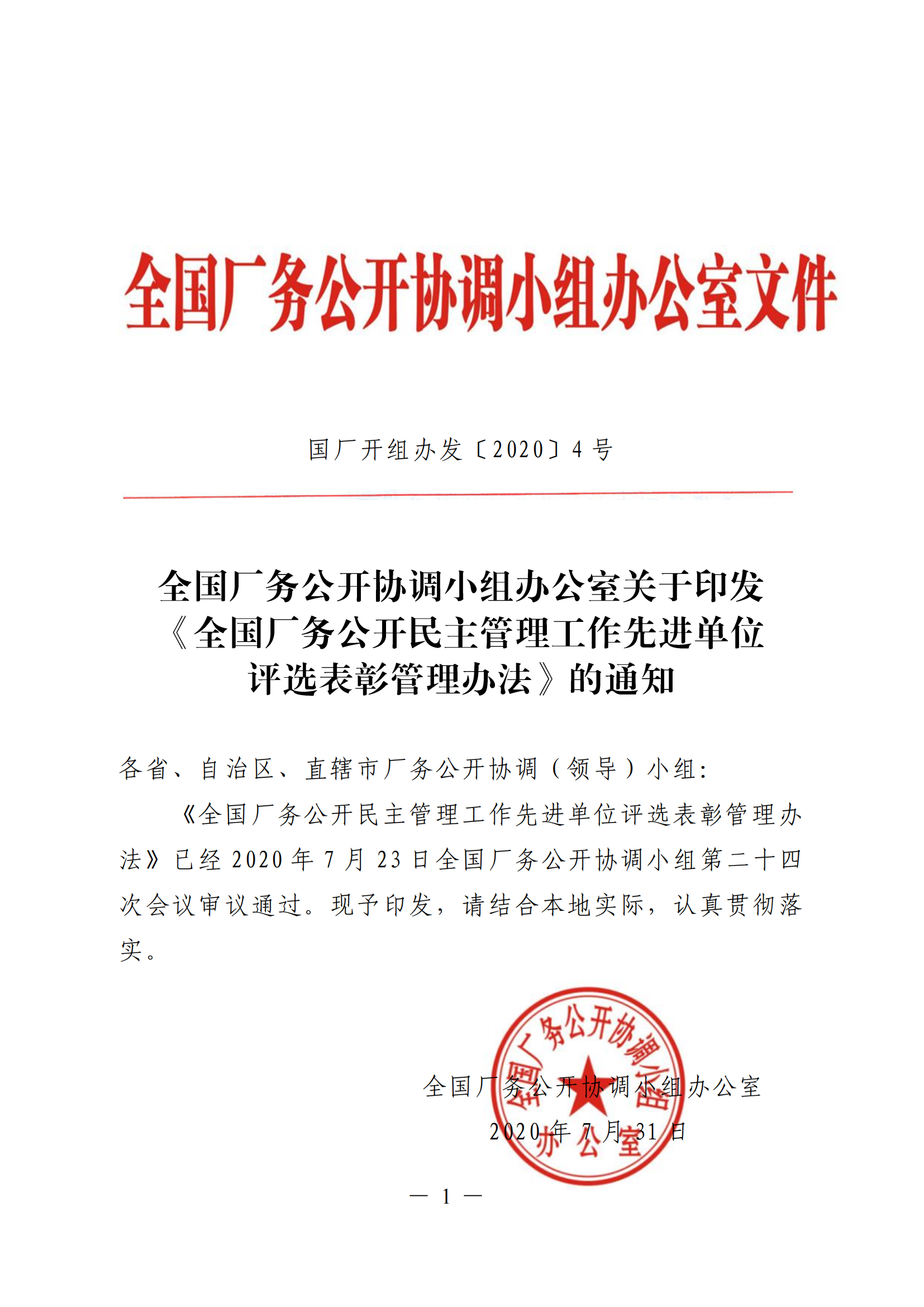 全国厂务公开协调小组办公室关于印发《全国厂务公开民主管理工作先进单位全国厂务公开协调小组办公室关于印发《全国厂务公开民主管理工作先进单位 评选表彰管理办法》的通知 国厂开组办发〔2020〕4 号