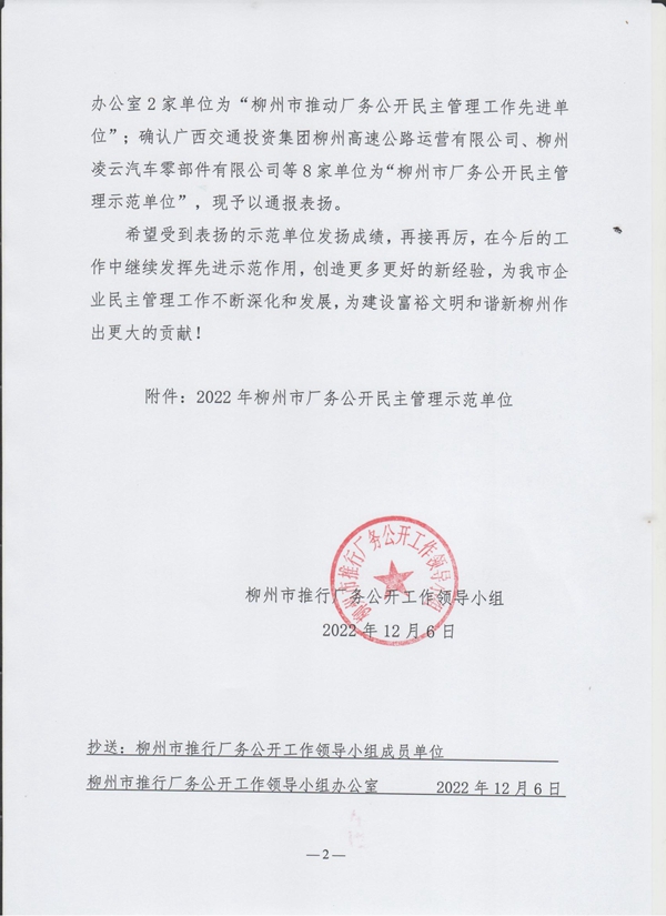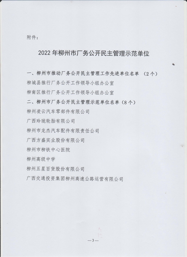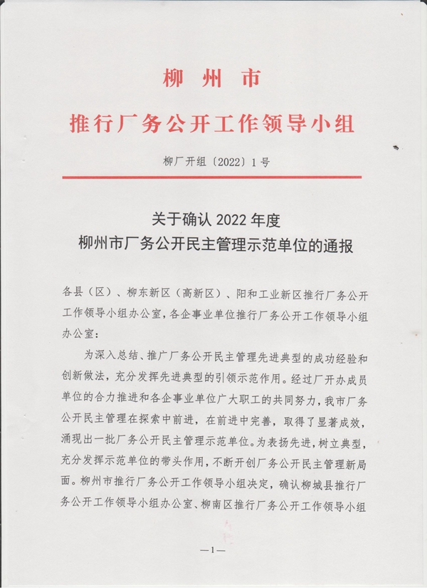 柳厂开组〔2022〕1号 关于确认2022年度柳州市厂务公开民主管理示范单位的通报