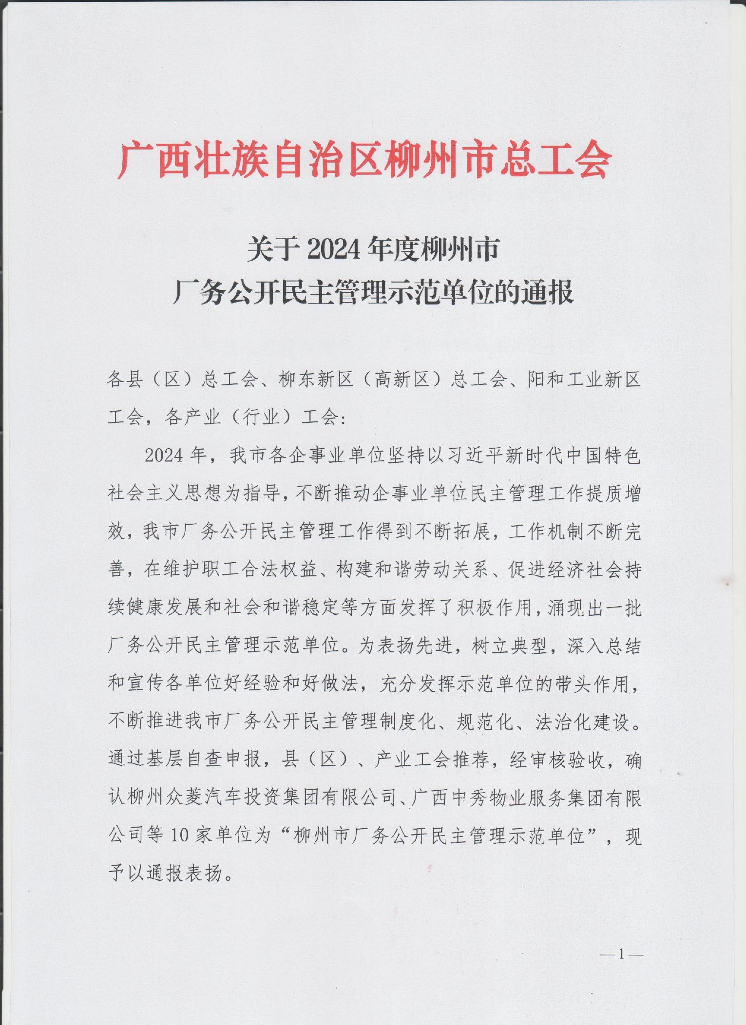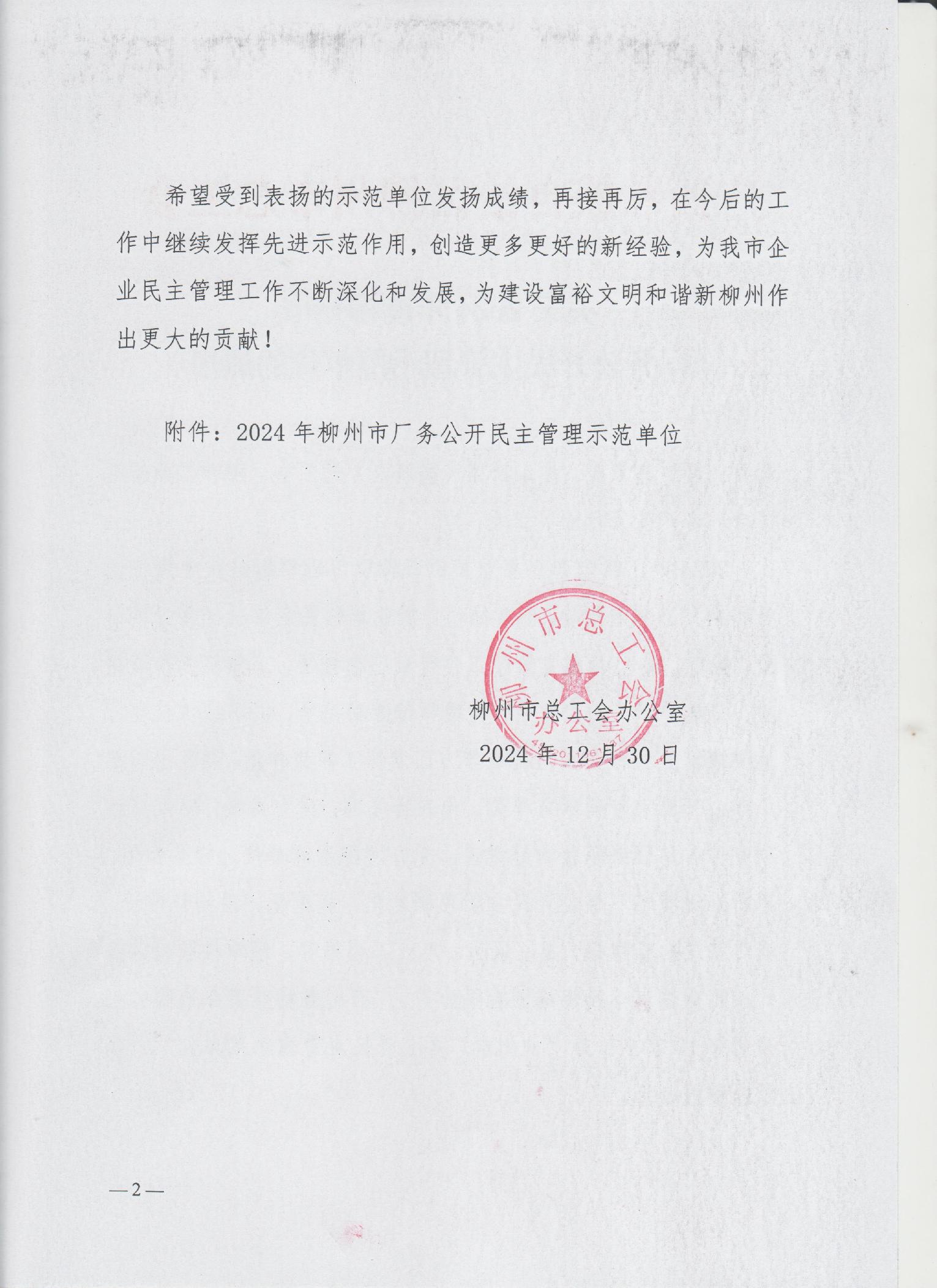 关于2024年度柳州市厂务公开民主管理示范单位的通报