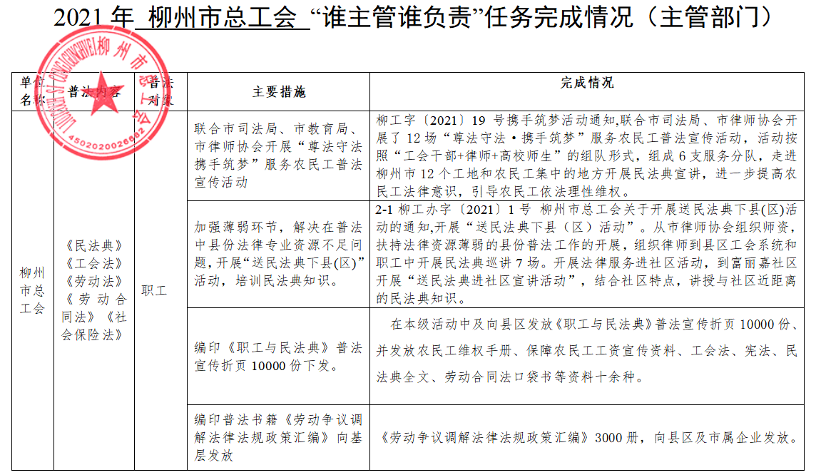 2021年柳州市总工会“谁主管谁负责”任务完成情况(主管部门)