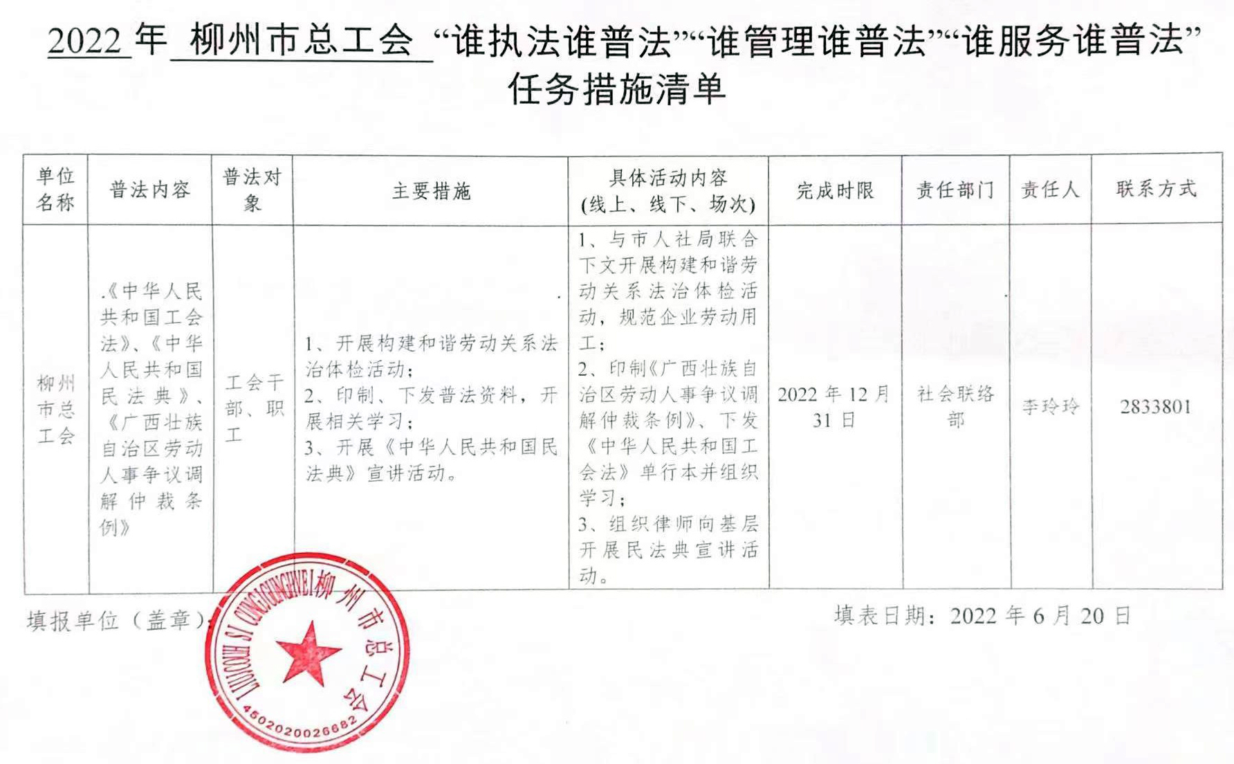 2022年柳州市总工会“谁执法谁普法""谁管理谁普法"谁服务谁普法”任务措施清单